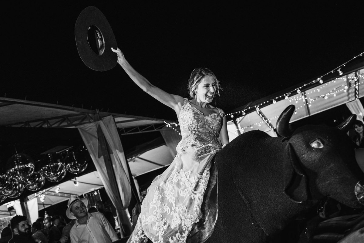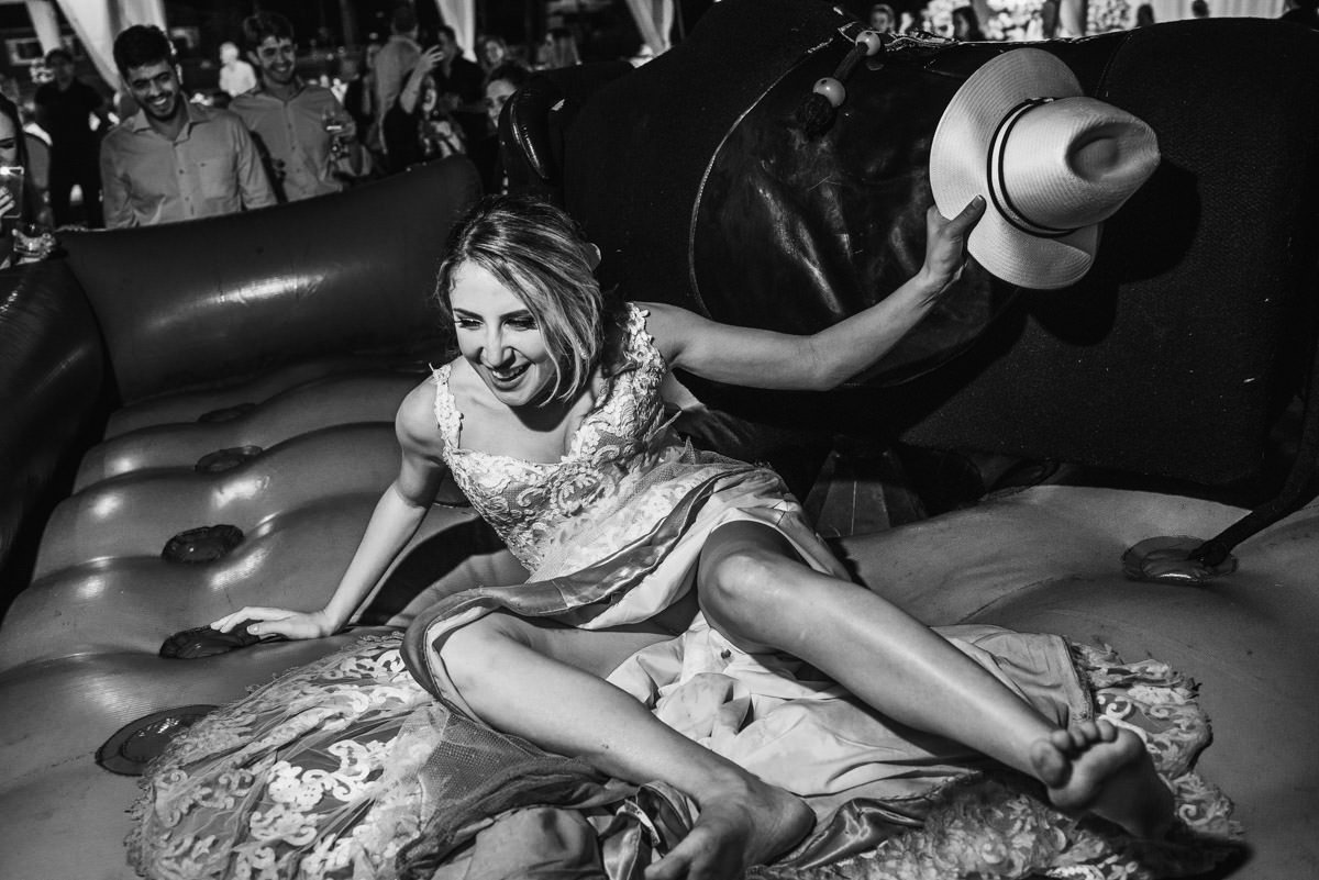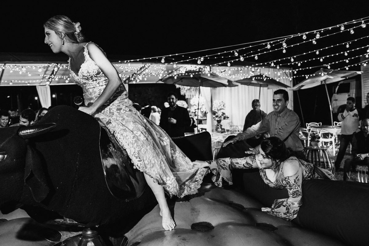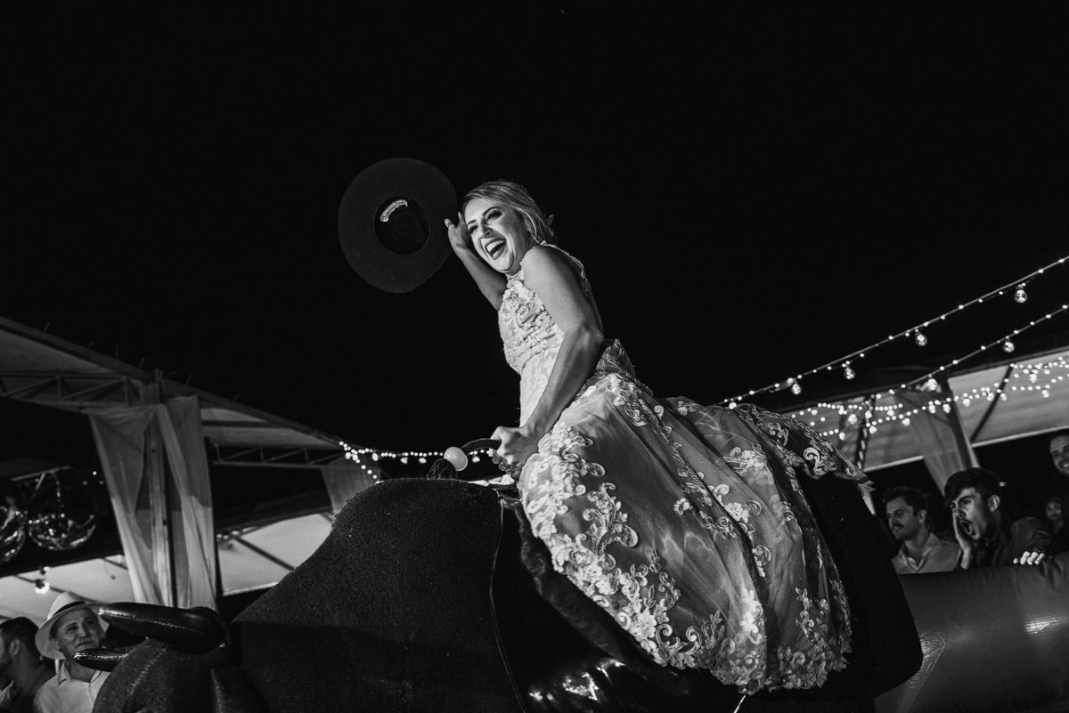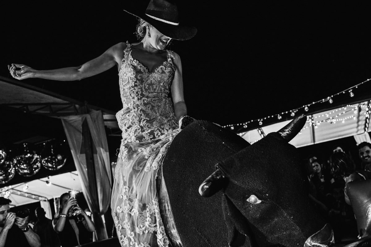 Quando rolou o ensaio de pré-casamento da Mari e do Renan, ficamos super ansiosos pro dia do casamento em Itabira, já que eles tinham contado tudo que ia rolar no dia. Touro mecânico, Mari equilibrando um copo na cabeça, “bazuca” de fumaça e, claro, muita animação.