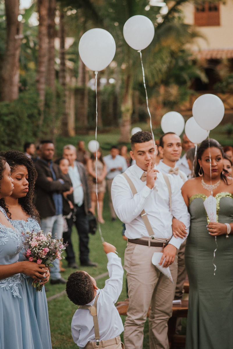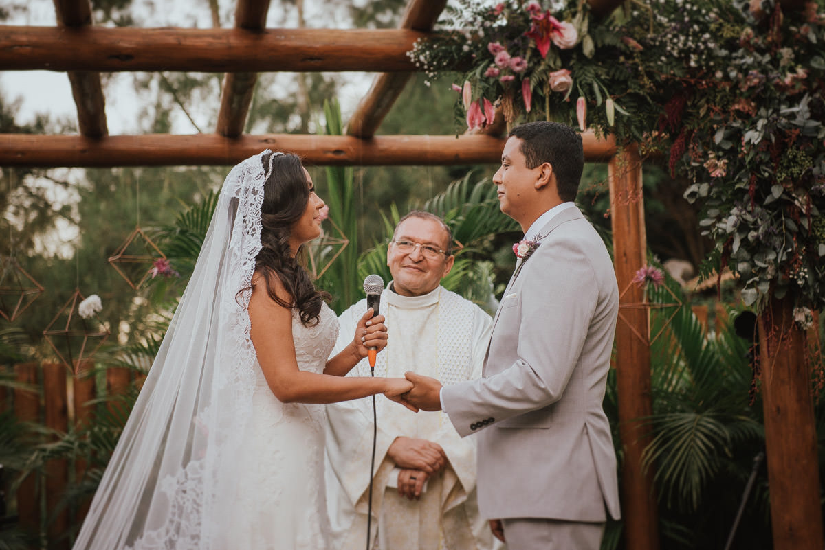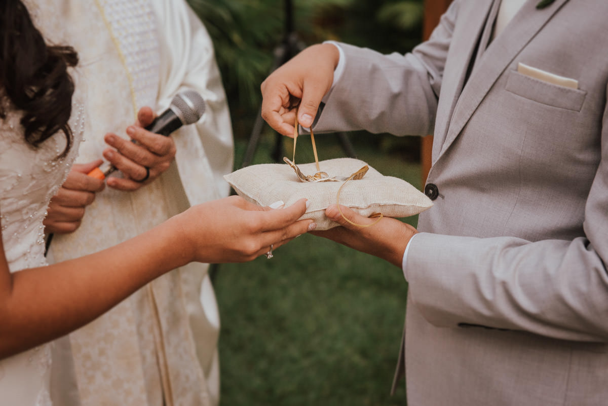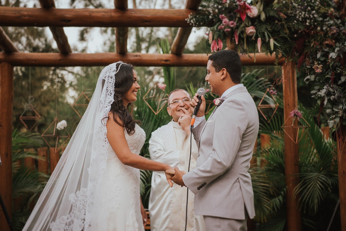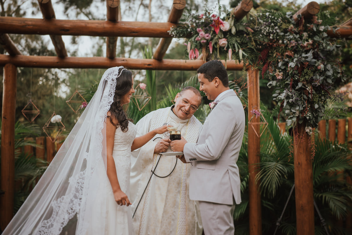 A cerimônia aconteceu no final da tarde, quando o sol dourado filtrado pelas árvores criava um cenário de filme. Capturamos detalhes como: