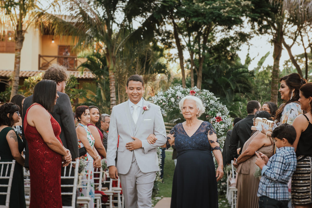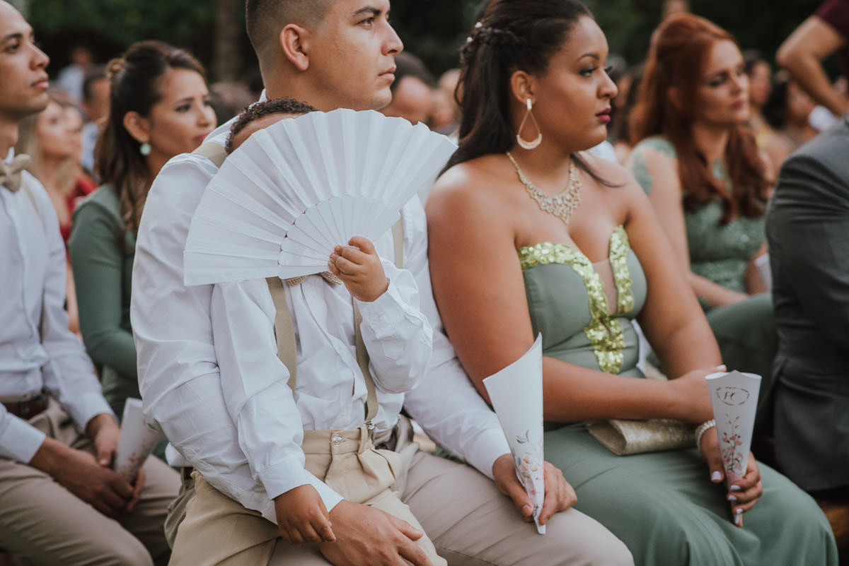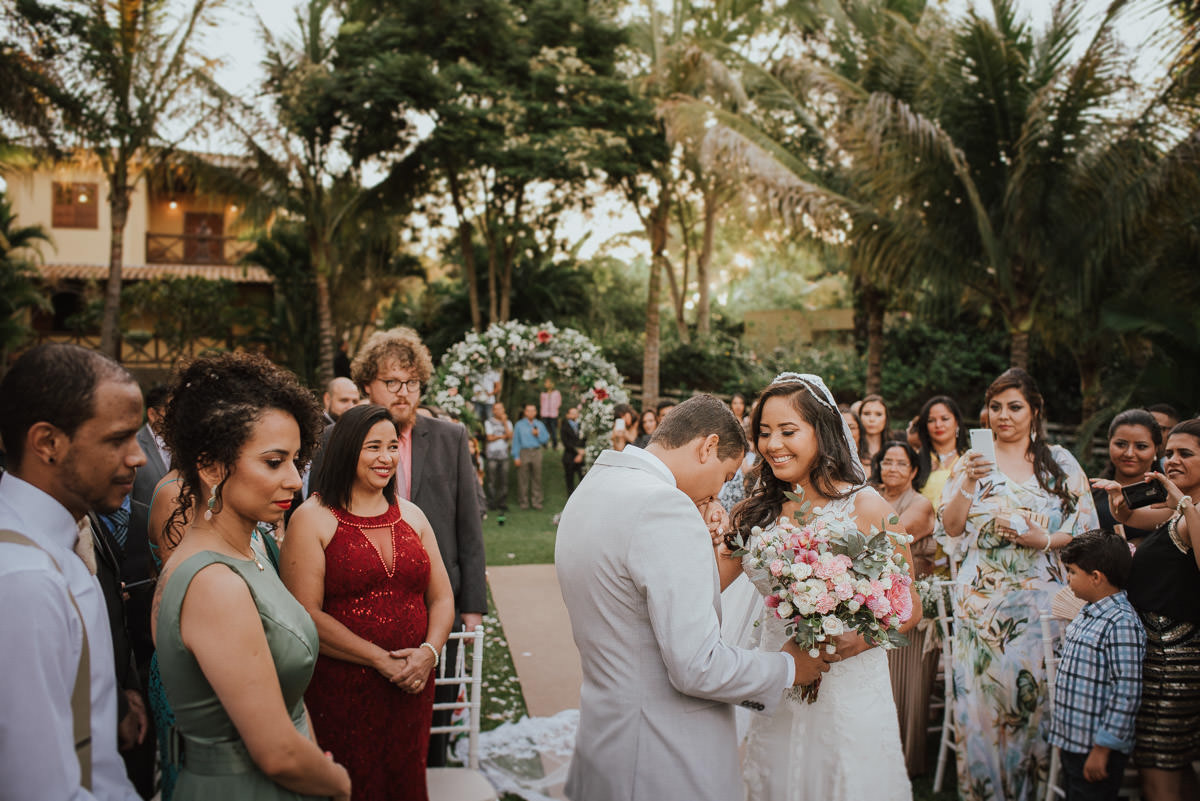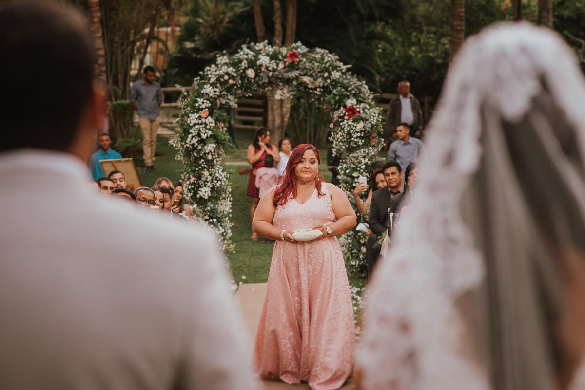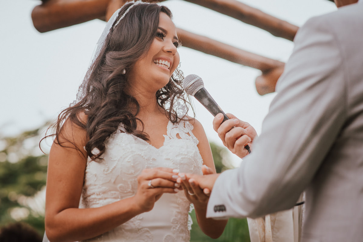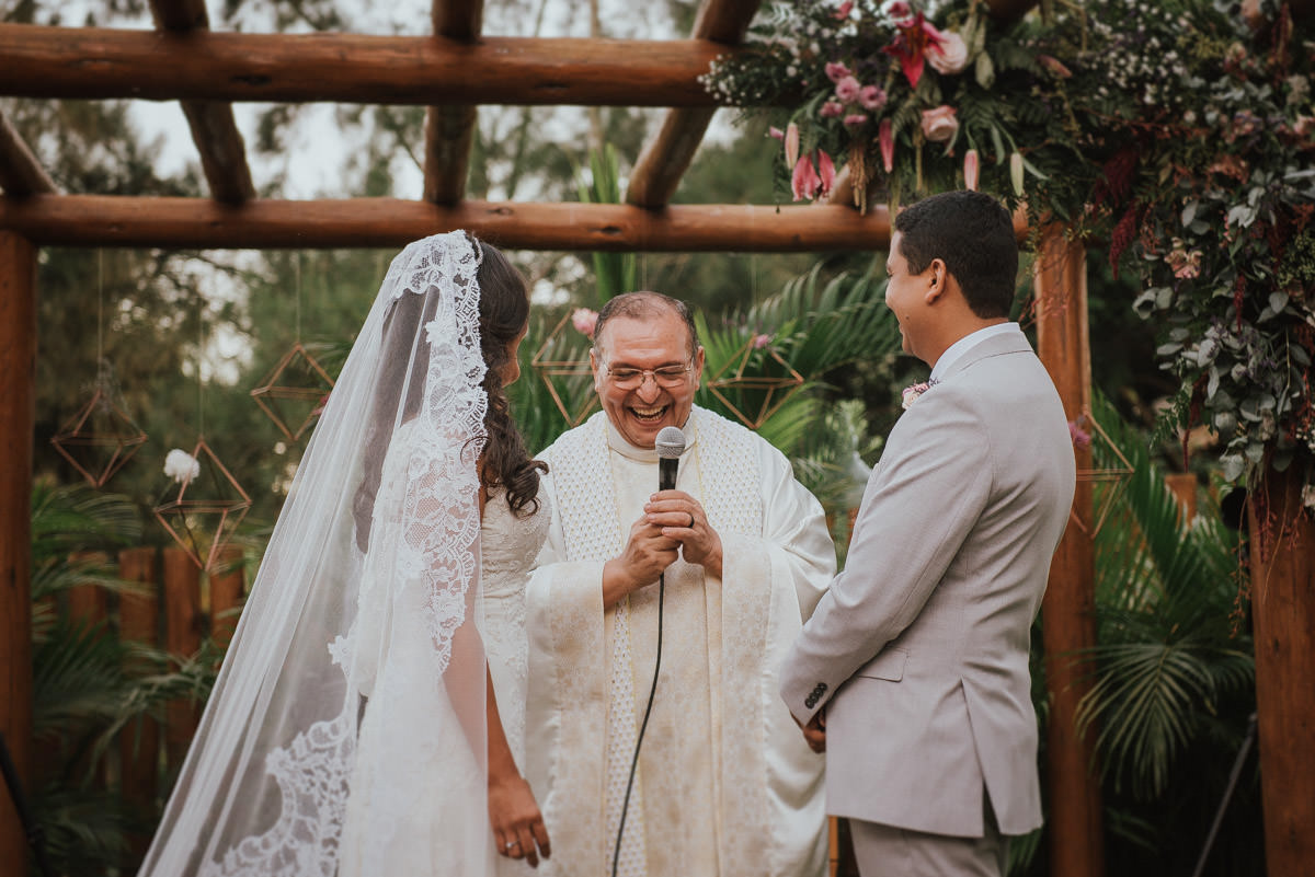 A cerimônia aconteceu no final da tarde, quando o sol dourado filtrado pelas árvores criava um cenário de filme. Capturamos detalhes como: