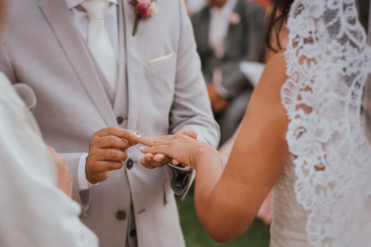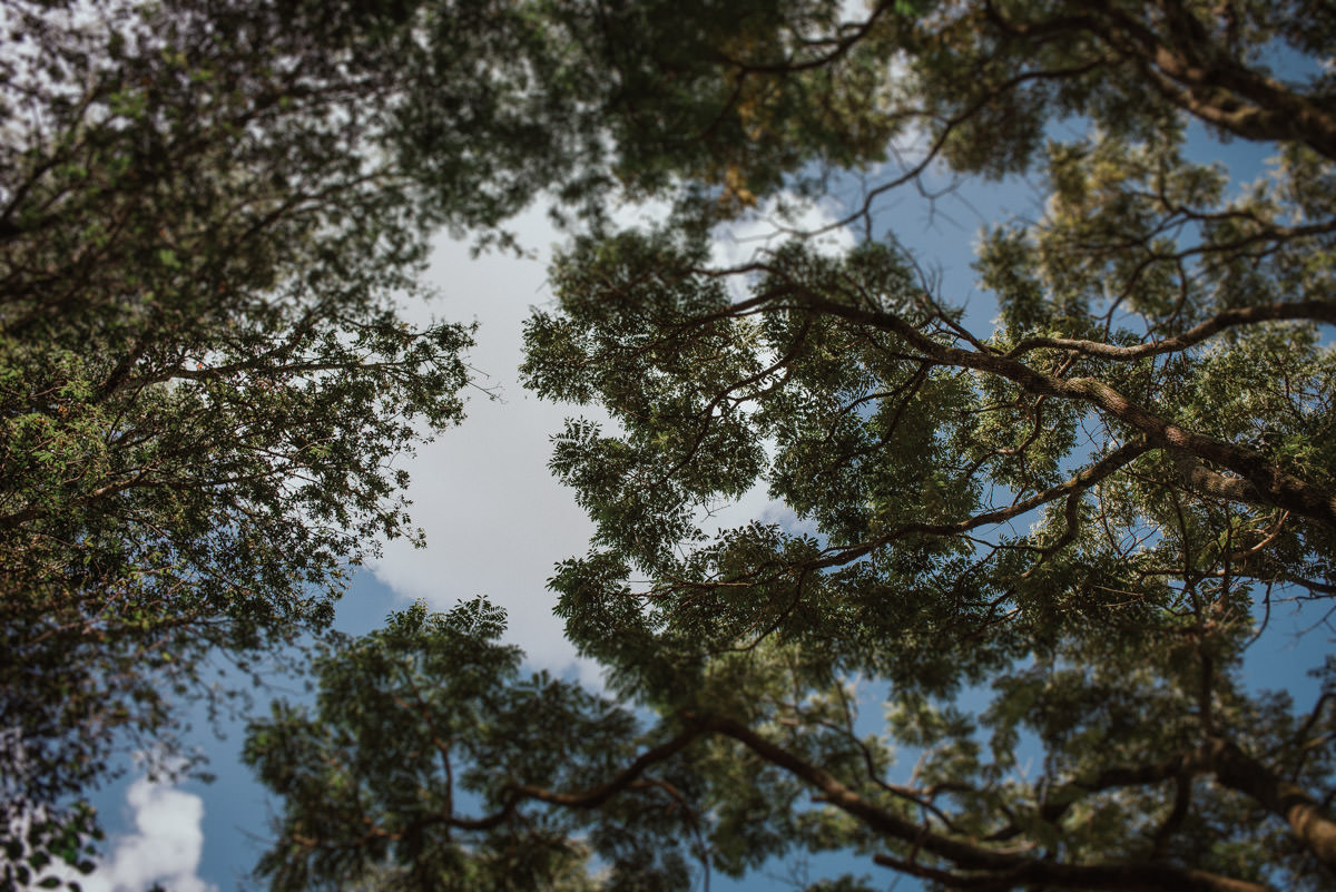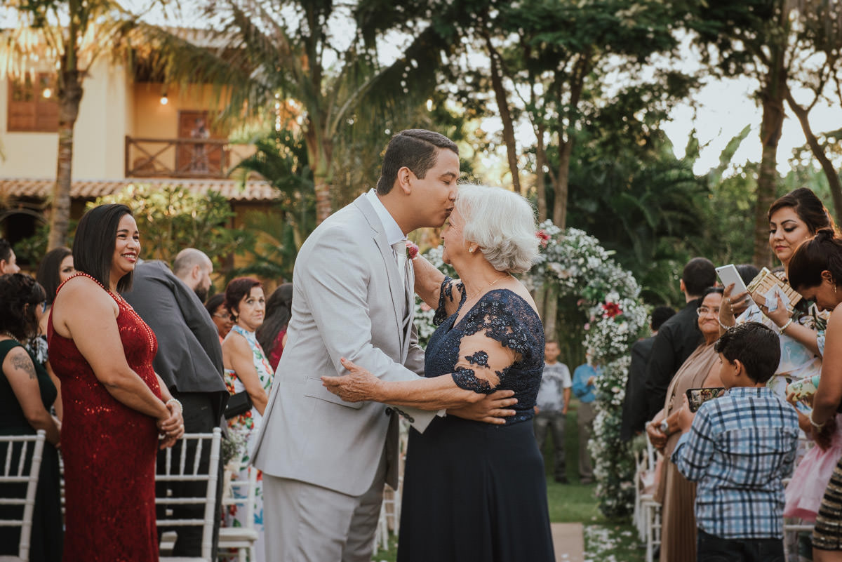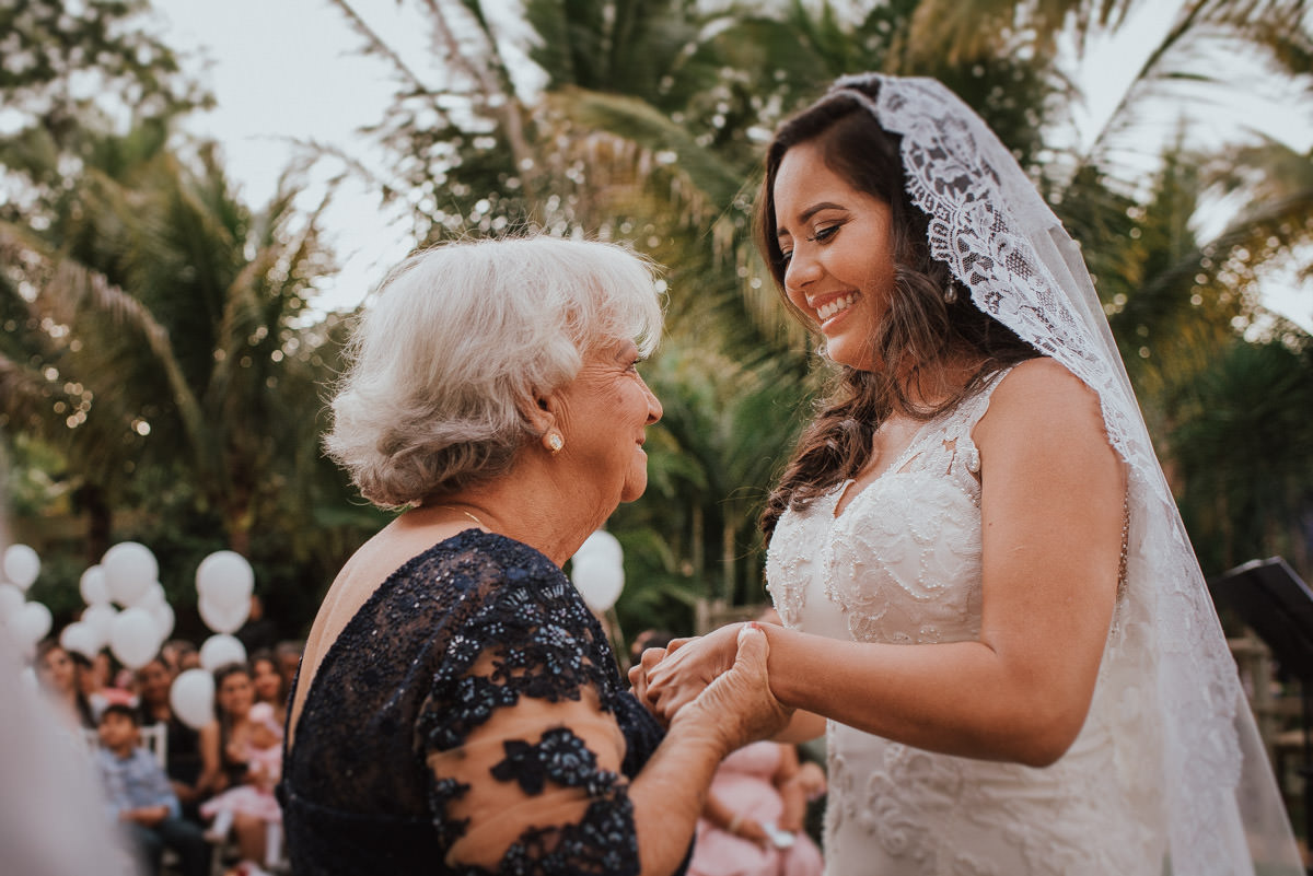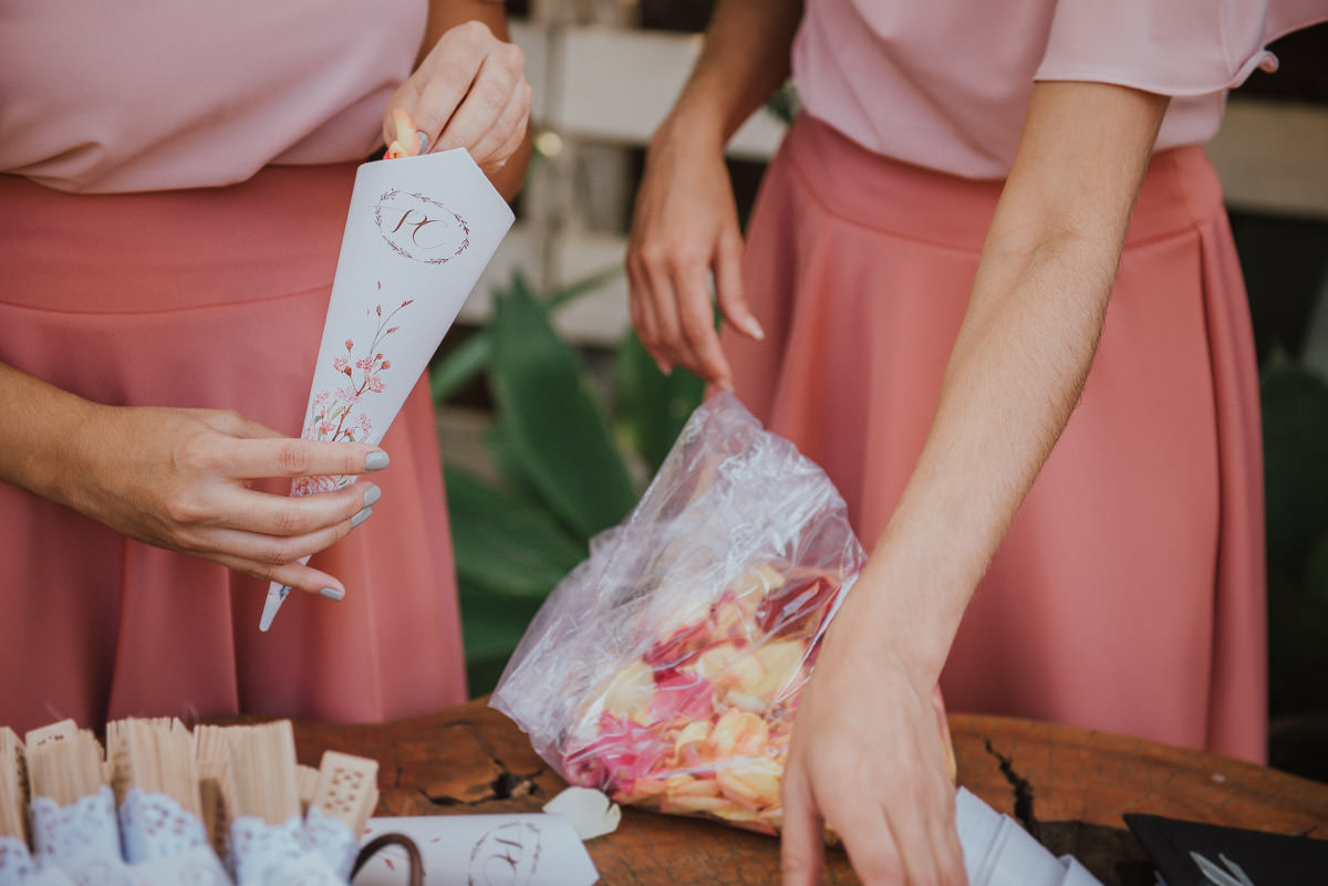 A cerimônia aconteceu no final da tarde, quando o sol dourado filtrado pelas árvores criava um cenário de filme. Capturamos detalhes como: