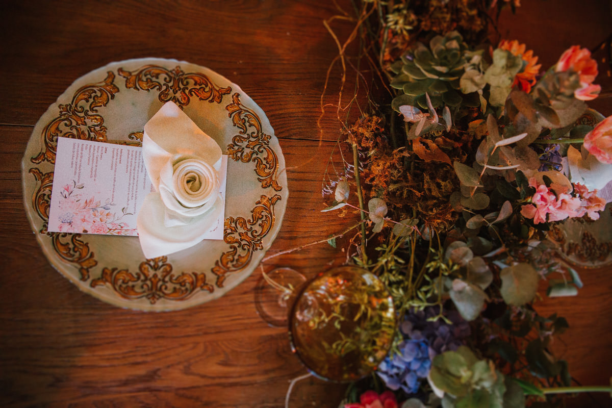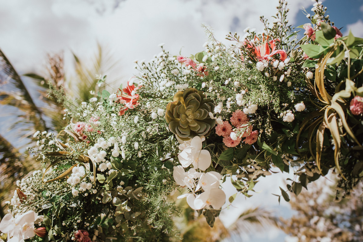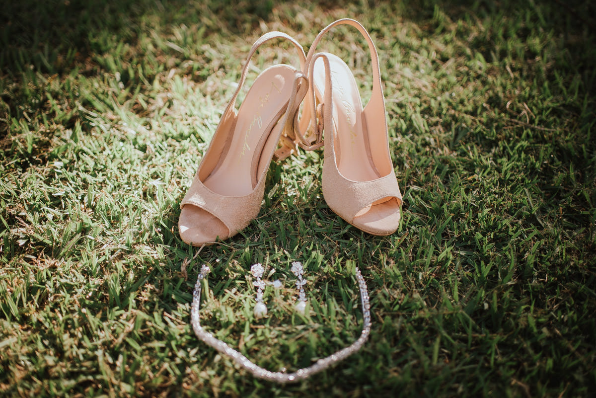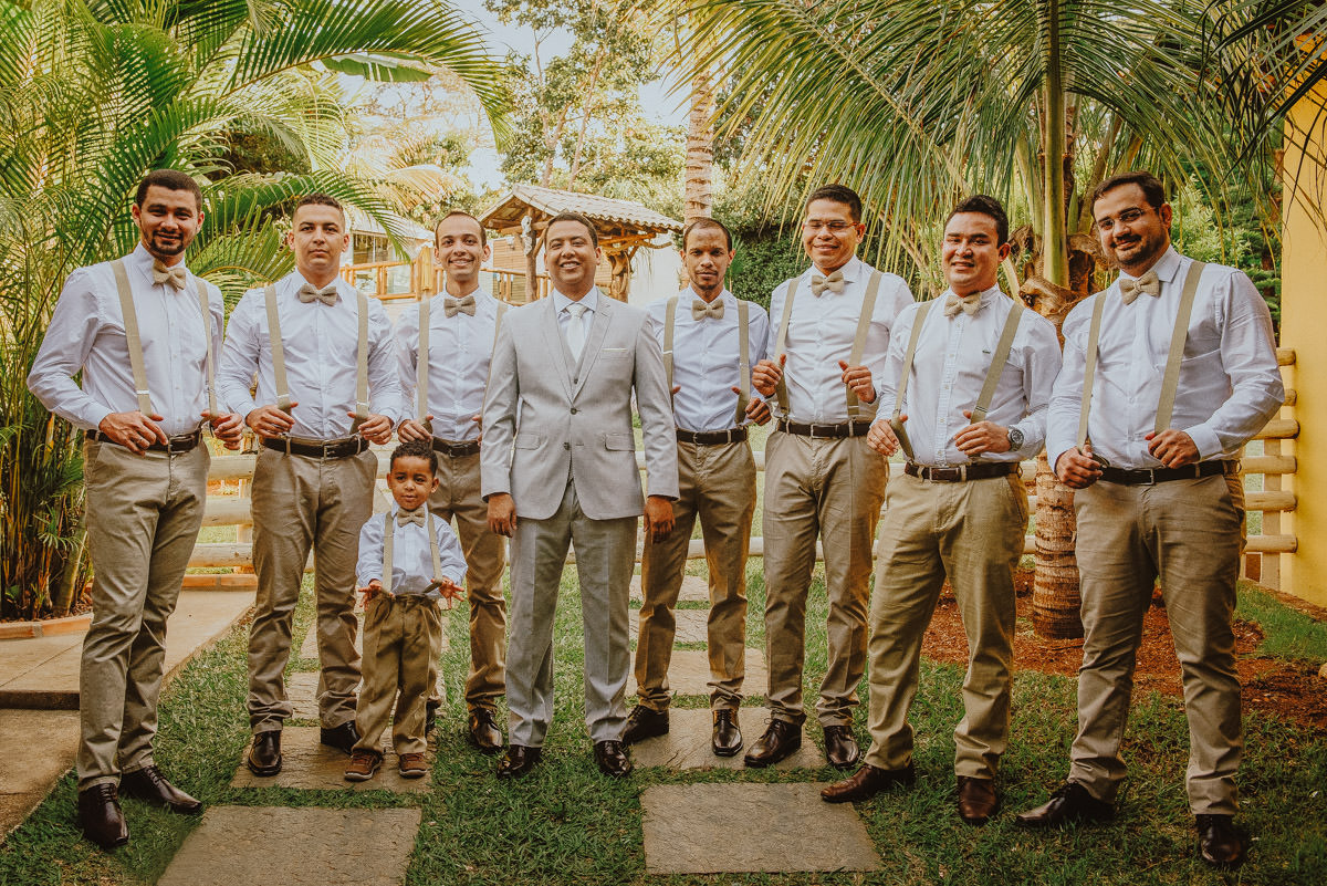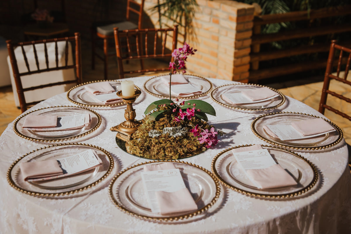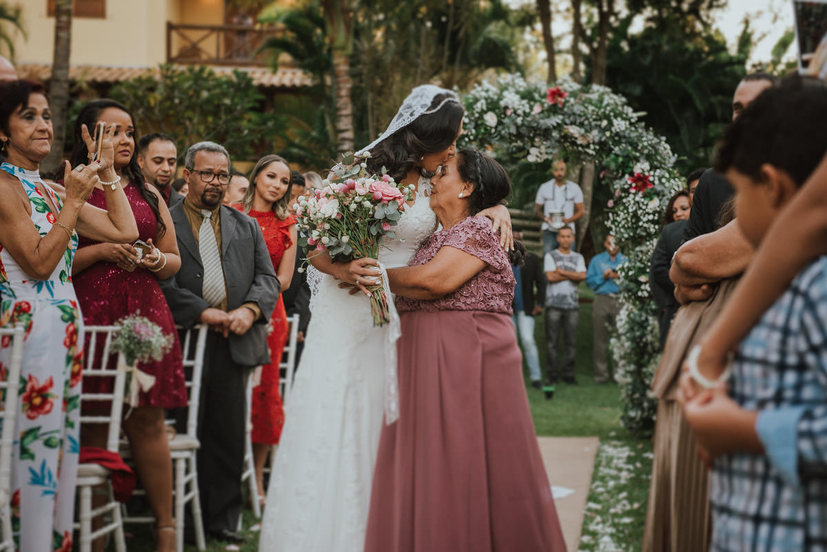 A cerimônia aconteceu no final da tarde, quando o sol dourado filtrado pelas árvores criava um cenário de filme. Capturamos detalhes como:
