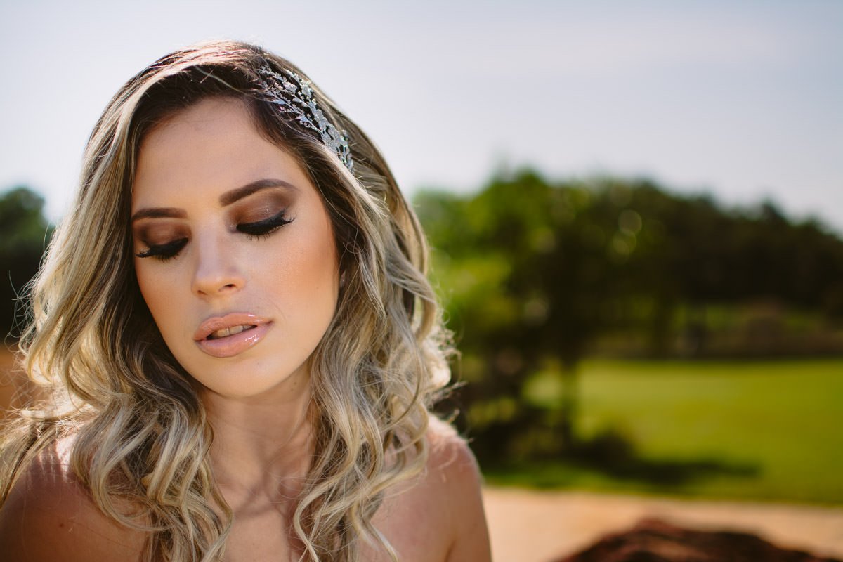A maquiagem do editorial foi feita pelo Lázaro Lambertucci, produzindo uma noiva mais imponente e menos bucólica. Portanto, abusou de tons terrosos e olhos bem marcados, trazendo referência de uma mulher forte, decidida e chique. Para os cabelos, optou por deixá-los soltos, para realçar a beleza da noiva e garantir seu conforto.